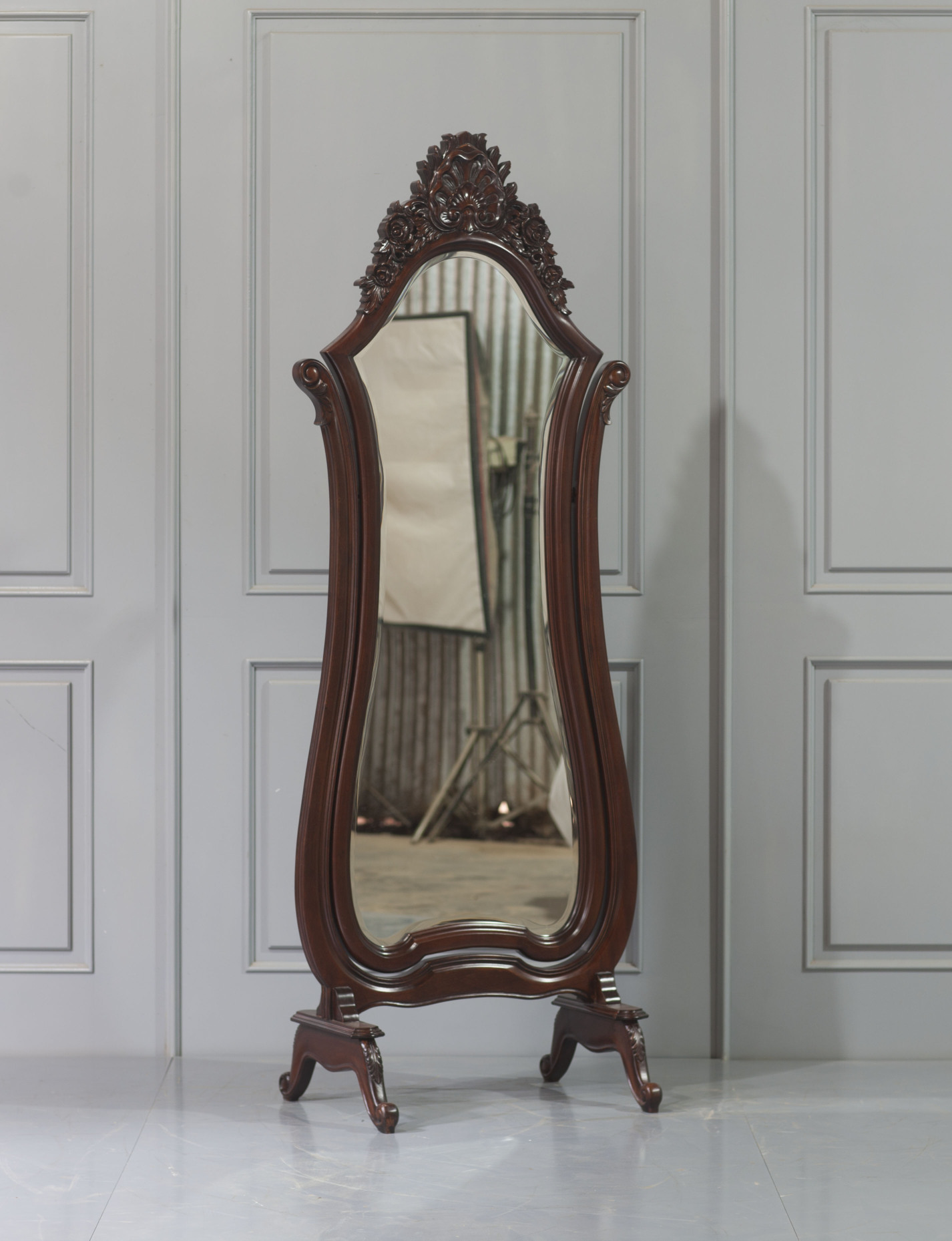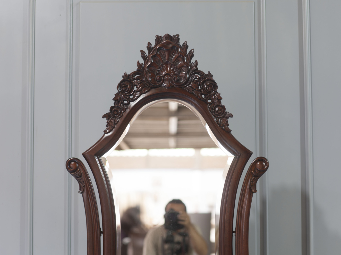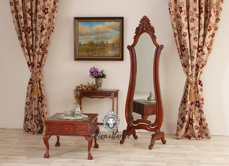 Die Lionsstar Möbeldesign GmbH produziert jedes Möbelstück handgefertigt. Dieser Spiegel Mahagoniholz ist mit wunderschönen, geschnitzten Verzierungen ausgestattet.