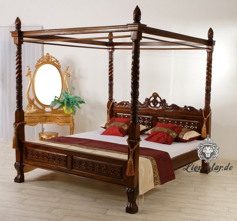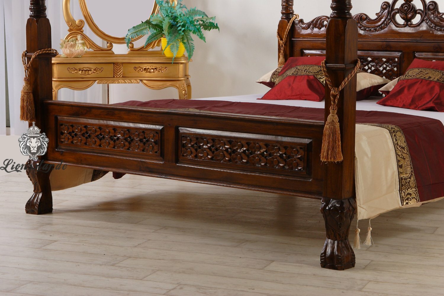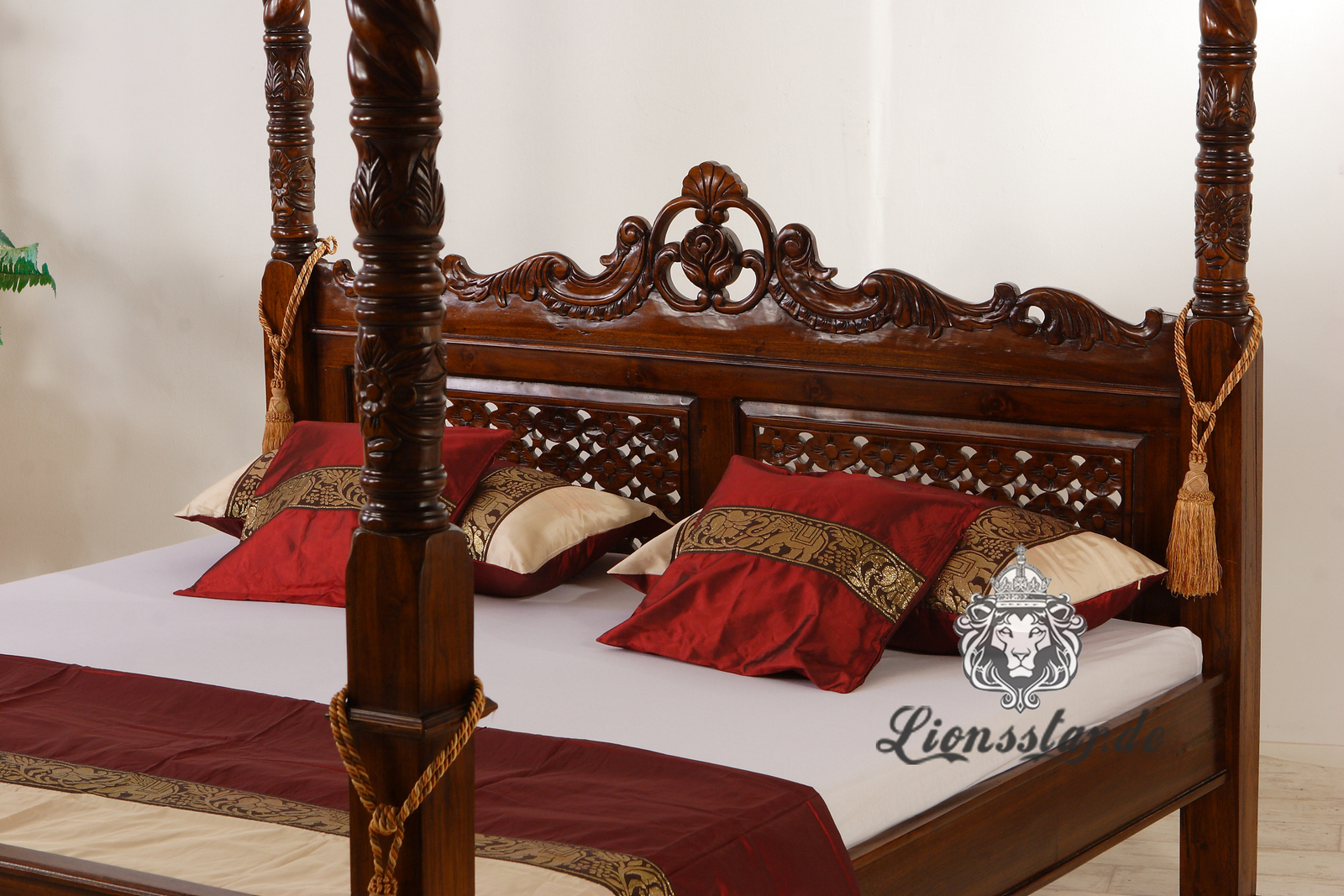 Die Lionsstar Möbeldesign GmbH produziert jedes Möbelstück handgefertigt. Dieses Luxus Himmelbett Mahagoni Teak hat ein prachtvolles Kopfteil mit wunderschön geschnitzten Verzierungen.