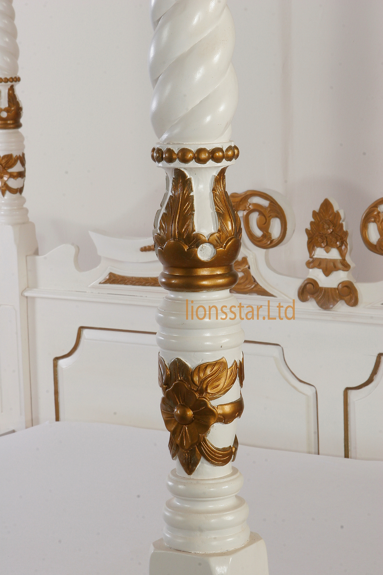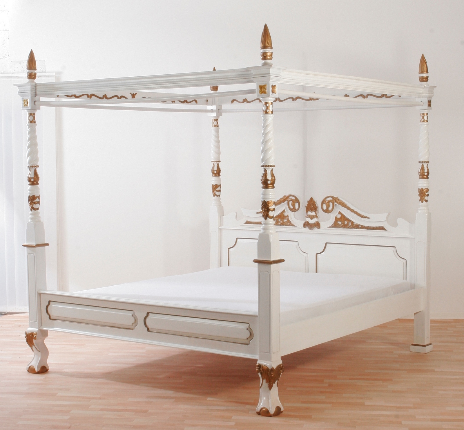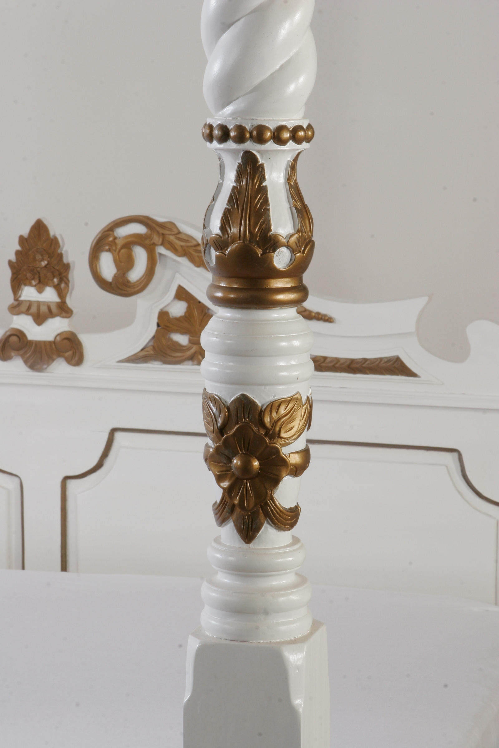 Die Oberfläche dieses Himmelbettes in der Farbe Weiß Gold wurde in mehreren aufwendigen Arbeitsgängen veredelt.