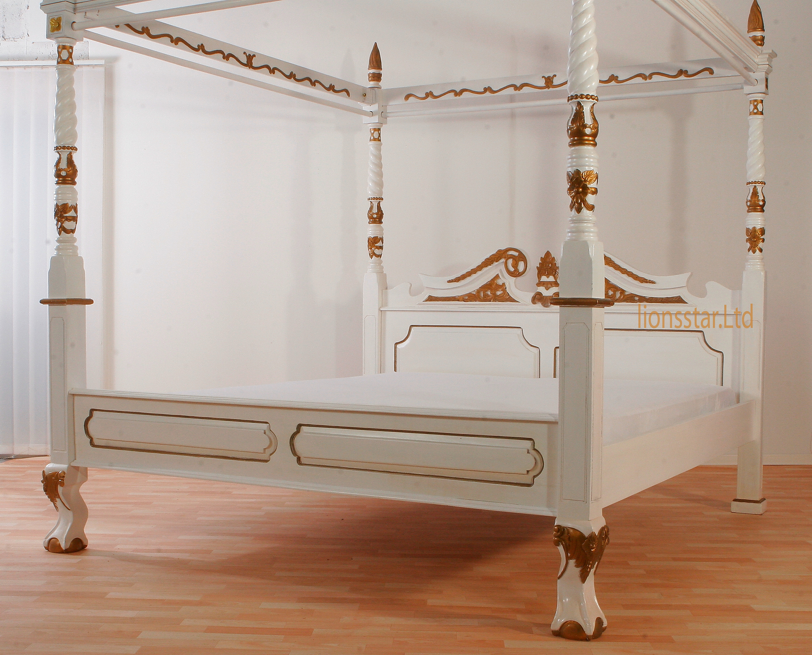 Die Lionsstar Möbeldesign GmbH produziert jedes Möbelstück handgefertigt. Dieses Himmelbett Massiv Mahagoni-Weiß-Gold hat ein prachtvolles Kopfteil mit wunderschön geschnitzten Verzierungen.