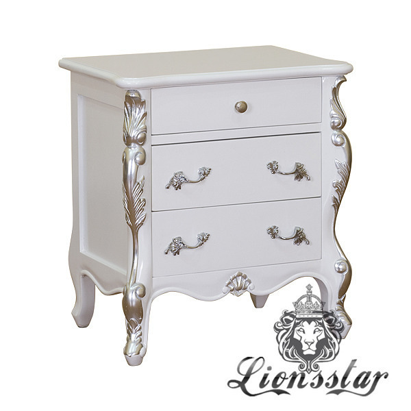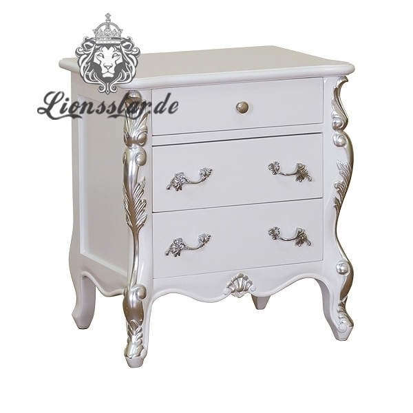 Die Lionsstar Möbeldesign GmbH produziert jedes Möbelstück handgefertigt. Dieser Nachttisch in der Farbe Weiß hat prachtvolle Fußteile mit wunderschönen, geschnitzten Verzierungen.