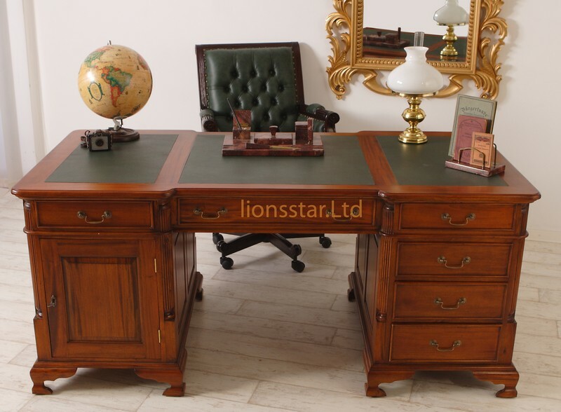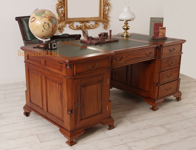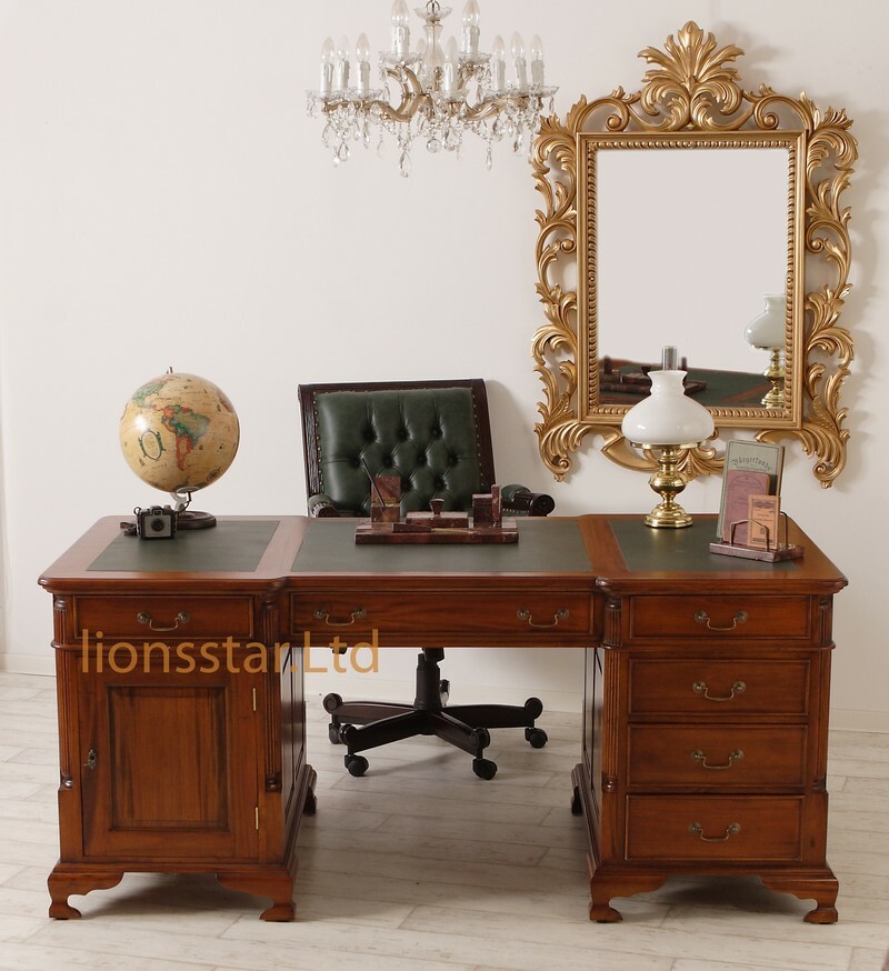 Die Lionsstar Möbeldesign GmbH produziert jedes Möbelstück handgefertigt. Dieser Schreibtisch aus Mahagoni Massivholz ist mit wunderschönen, geschnitzten Verzierungen ausgestattet.