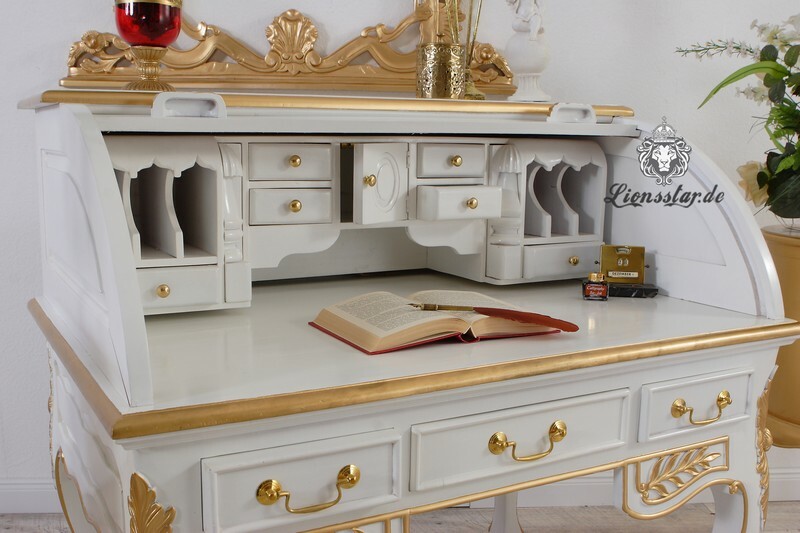 Die Lionsstar Möbeldesign GmbH produziert jedes Möbelstück handgefertigt. Dieser Sekretär Weiß Sissi aus massivem Mahagoniholz ist mit wunderschönen, geschnitzten Verzierungen ausgestattet.