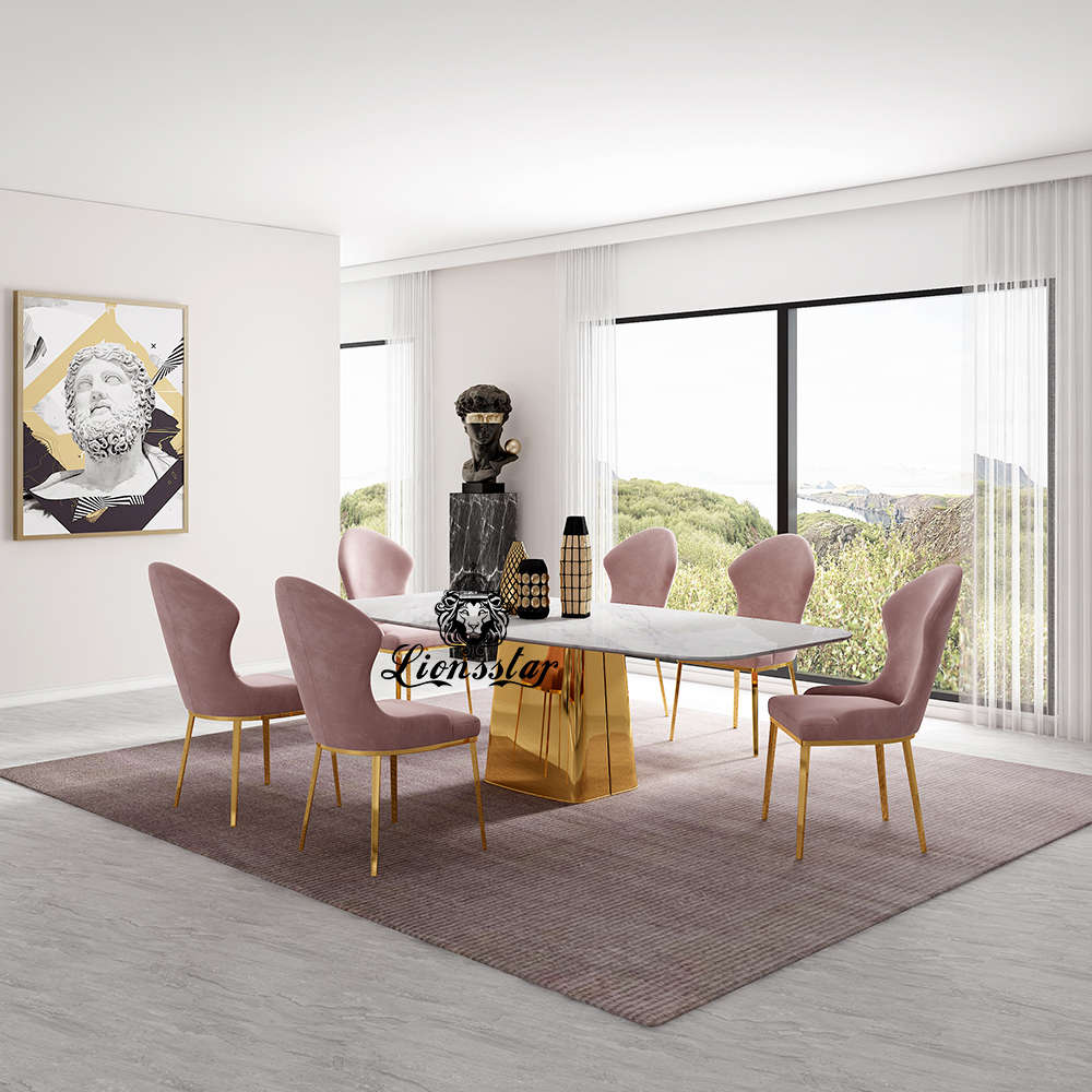 Die Lionsstar Möbeldesign GmbH produziert jedes Möbelstück handgefertigt. Dieser handgefertigter Luxus Designer Esstisch Gold Tower hat edle Metall-Elemente und eine exklusive Platte mit modernem Charm.
