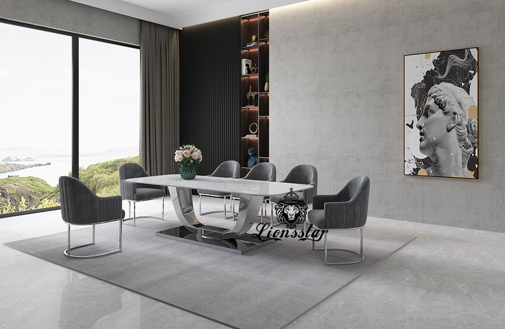 Die Lionsstar Möbeldesign GmbH produziert jedes Möbelstück handgefertigt. Dieser handgefertigte Luxus Designer Esstisch New York hat edle Metall-Elemente und eine exklusive Platte mit modernem Charm.