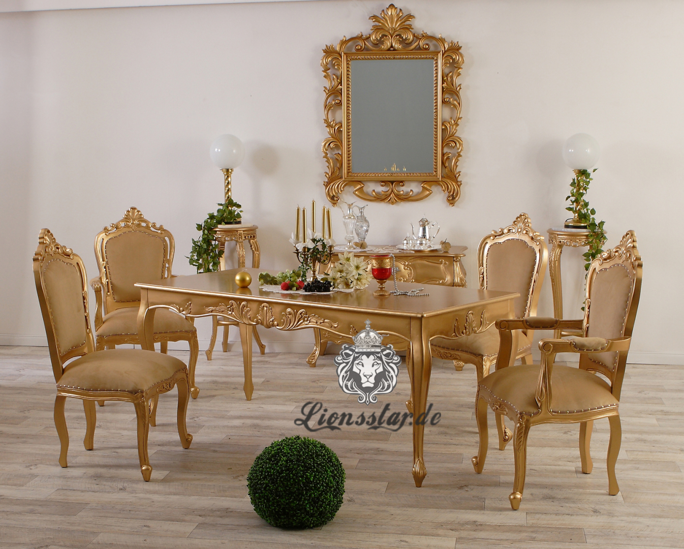 Die Lionsstar Möbeldesign GmbH produziert jedes Möbelstück handgefertigt. Dieser Esstisch Venezia Gold aus massivem Mahagoniholz hat prachtvolle Fußteile mit wunderschönen geschnitzten Verzierungen.