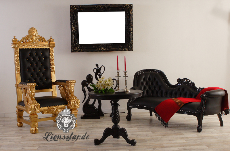 Die Lionsstar Möbeldesign GmbH produziert jedes Möbelstück handgefertigt. Dieser Thronstuhl Sphinx Gold Schwarz aus massivem Mahagoniholz hat prachtvolle Fußteile mit wunderschönen geschnitzten Verzierungen.