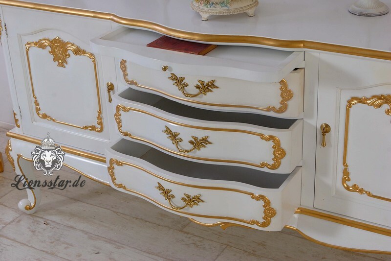 Die Lionsstar Möbeldesign GmbH produziert jedes Möbelstück handgefertigt. Diese Barock Kommode in der Farbe Weiß Gold hat prachtvolle Fußteile mit wunderschönen geschnitzten Verzierungen.