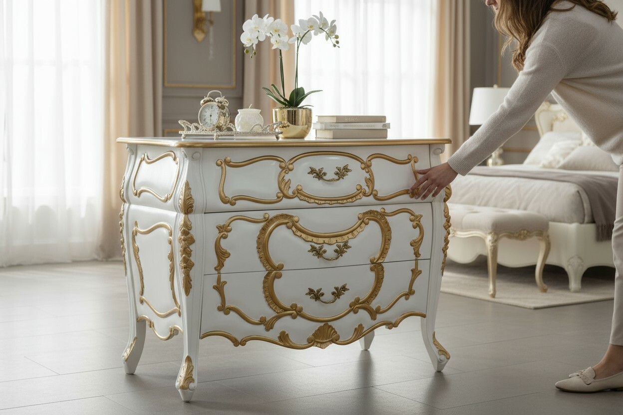 Bei uns finden Sie 100% handgefertigte Barock Kolonialstil Kommode Rokoko Regenbogenmöbel der Luxusklasse. Durch die Fertigung, die ausschließlich per Hand erfolgt, hat jedes Möbelstück seinen ganz eigenen Charme.