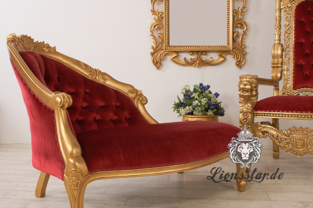 Bei uns finden Sie 100% handgefertigte Luxus Recamiere Rococo Gold-Rotmöbel der Luxusklasse. Durch die Fertigung, die ausschließlich per Hand erfolgt, hat jedes Möbelstück seinen ganz eigenen Charme.
