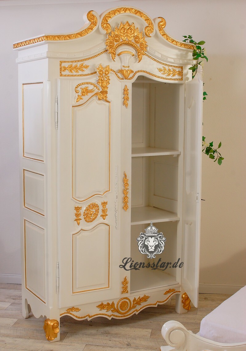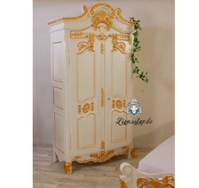 Die Lionsstar Möbeldesign GmbH produziert jedes Möbelstück handgefertigt. Dieser Schrank Barock Schrank Weiß-Gold aus massivem Mahagoniholz hat prachtvolle Fußteile mit wunderschönen geschnitzten Verzierungen.